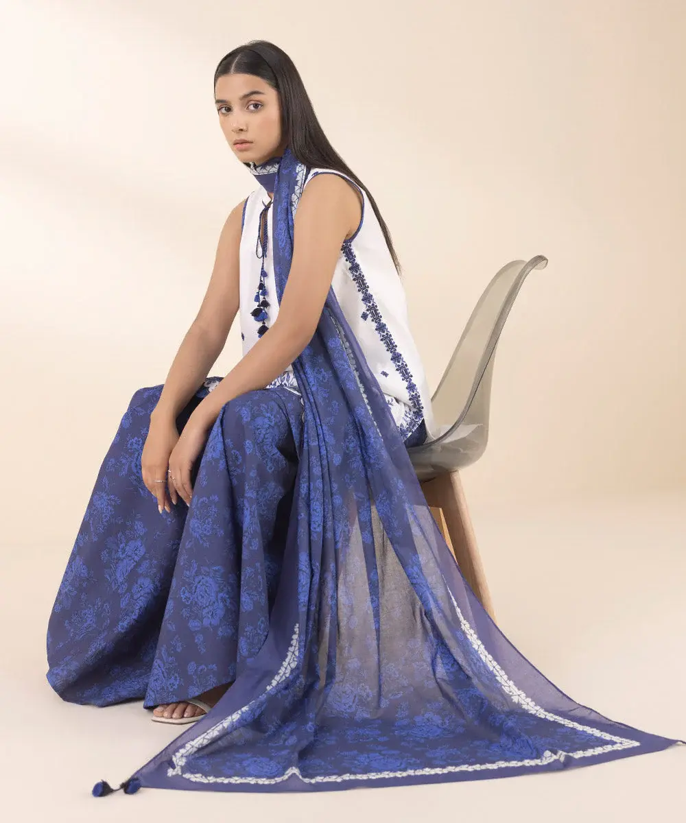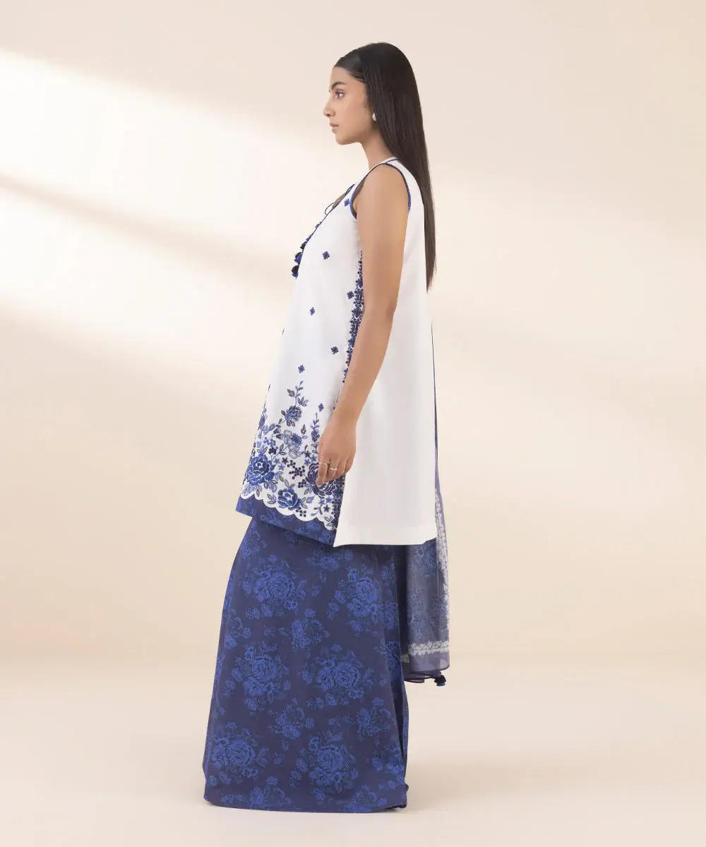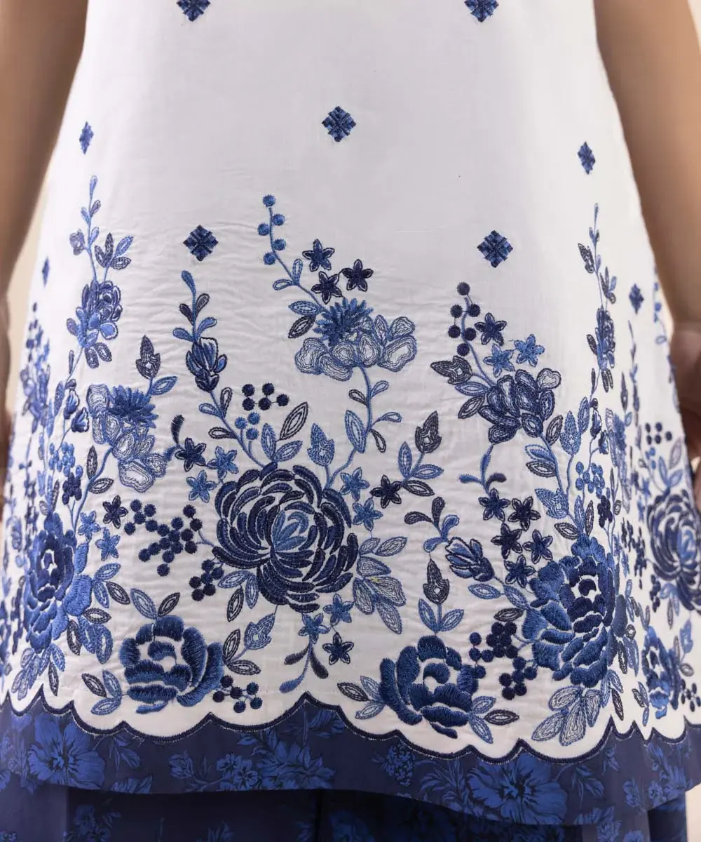 Make a statement in our off white and blue lawn three piece embroidered suit with a voile dupatta.