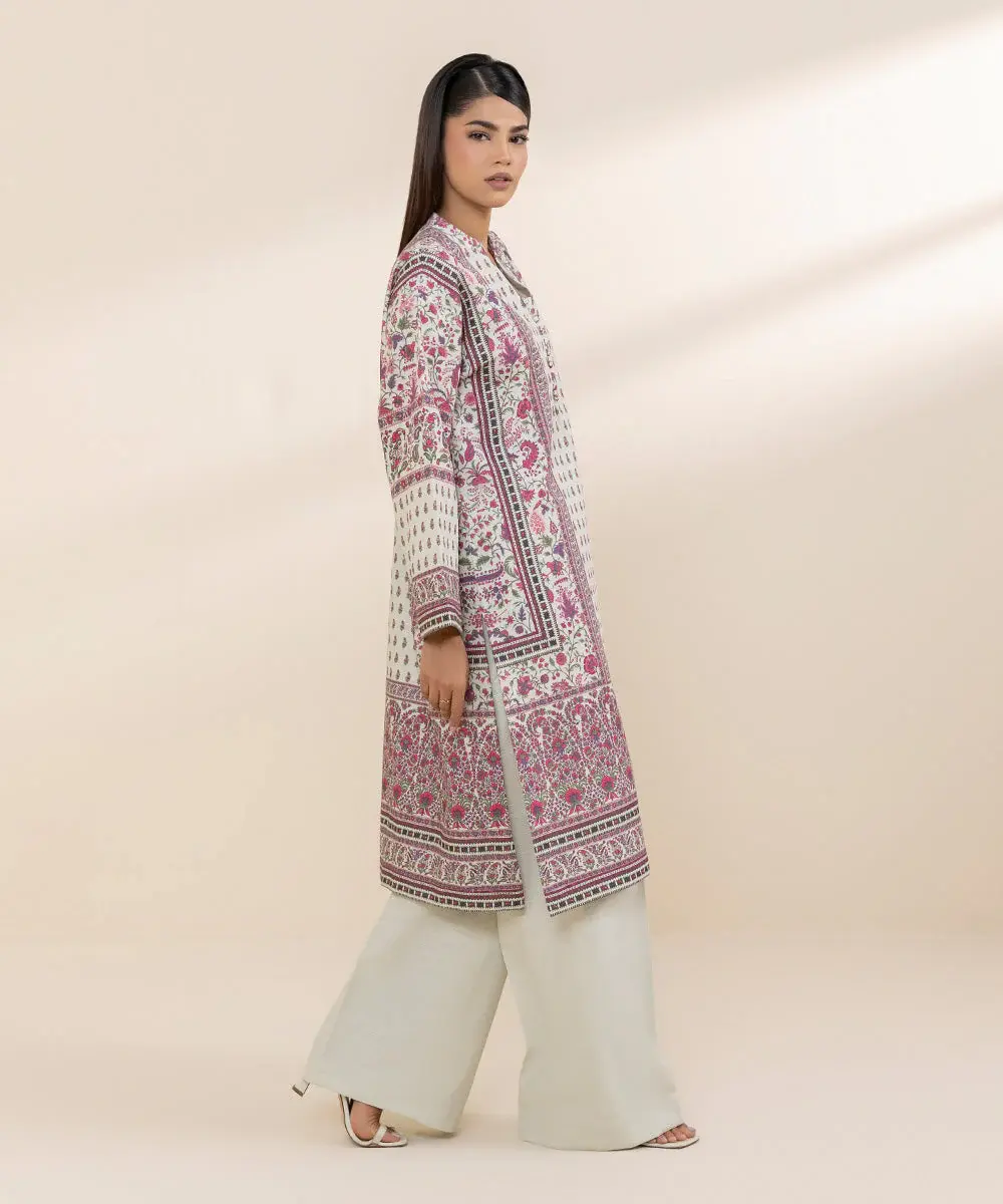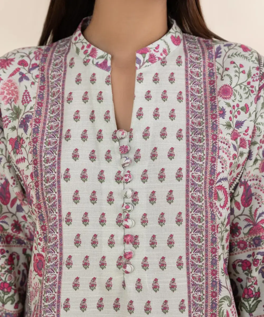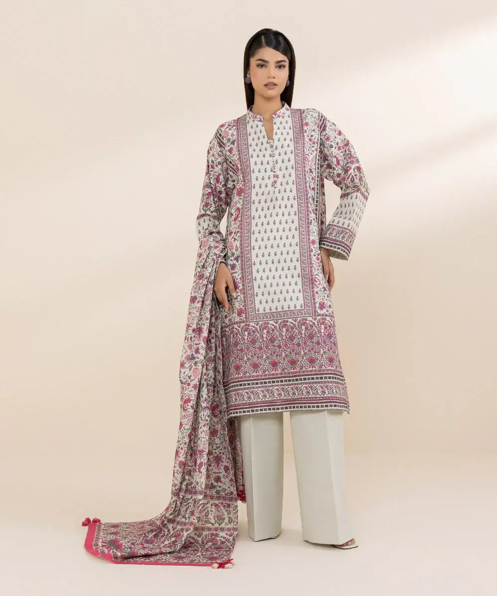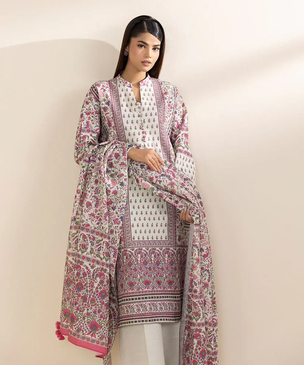 Step out confidently this fall in our printed ivory and pink 3-piece featuring khaddar shirt and solid trousers.