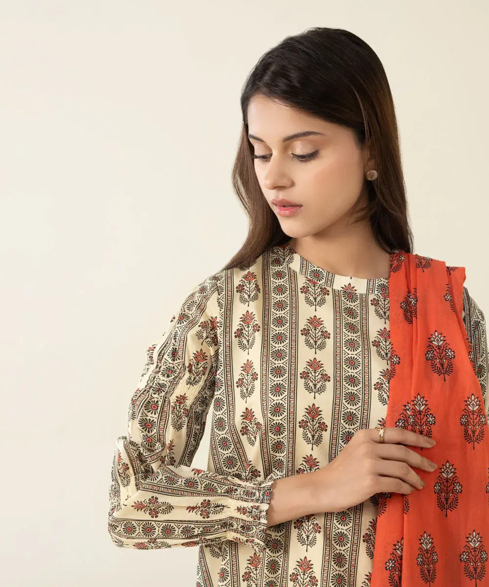 Celebrating the opulence of Sindhi patterns and Jaipur prints within an exquisite collection. Our off white and coral lawn suit features the rich heritage and artistry, showcasing the mesmerizing fusion of tradition and contemporary fashion.