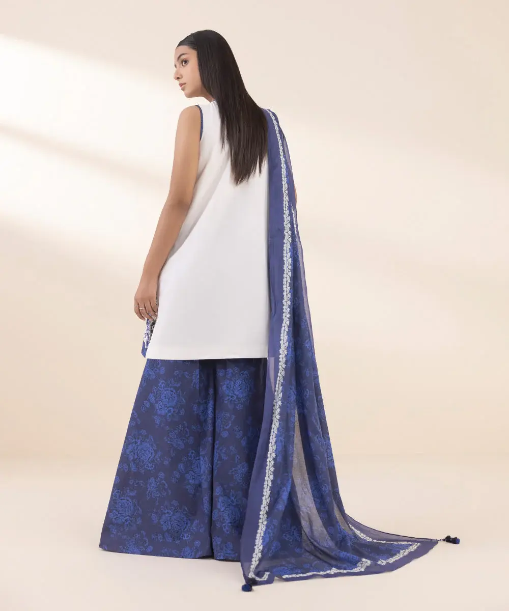 Make a statement in our off white and blue lawn three piece embroidered suit with a voile dupatta.