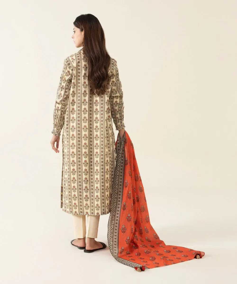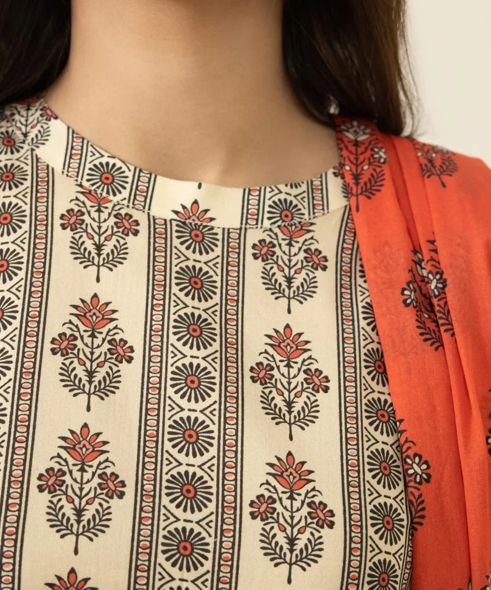 Celebrating the opulence of Sindhi patterns and Jaipur prints within an exquisite collection. Our off white and coral lawn suit features the rich heritage and artistry, showcasing the mesmerizing fusion of tradition and contemporary fashion.